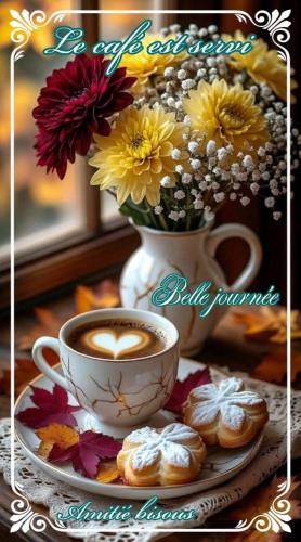 Bonjour Brigitte c'est mercrerdi 5 novembre ce matin reprise de la gym tonic + courses magasins legumes viande hier 22 eme tonte et ramassé les feuilles mortes tout est fait il me reste les gros pots à rentrer le petit café gourmand est servi |