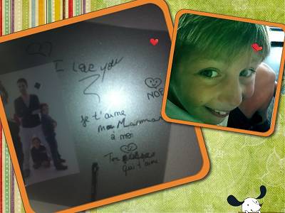 Et aujourd'hui je partage avec vous mon plus grand plaisir vécu du mois : Comme je vous l'ai dit la semaine dernière mes enfants Axel et Noé sont partis en vacances dans ma famille du coté de Nantes. Et ce week end j'ai découvert un immense cadeau de la part de mon fils Axel. En effet dans mon bureau il y a un tableau sur lequel je peux noter des choses et d'ailleurs, à mon dernier départ pour une journée positive, j'y avais indiqué un mot pour chacun de mes hommes. Il y en avait un donc pour Axel qui disait, Je t'aime fort mon Axel heart signé ta maman qui t'aime Et bien là, mon Axel sans rien nous dire, est allé dans mon bureau, il a effacé axel et a mis à la place Maman et il a signé " ton fisse"lol qui t'aime. Ohhhhhhh j'ai craqué en lisant ça je l'ai appeler aussitôt pour lui dire non seulement merci mais surtout lui dire ce que j'avais ressenti à lire son petit mot et à quel point j'avais été touché par sa démarche:) Un beau cadeau qui m'a donner un plaisir immense ! Et vous quels sont vos plaisirs du mois de juillet ? |