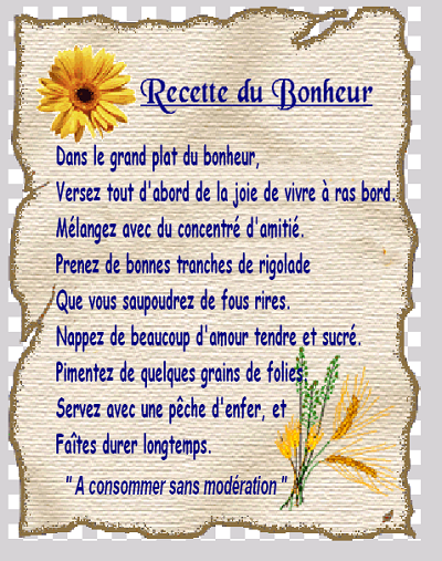 coucou les amies, désolées, si je ne suis pas venues plus tôt aujourd'hui, mais je suis partie tôt ce matin, et j''ai été prise jusqu'à maintenant!!! :( :( Bonjour à vous toutes, Janine, Jeanne, Mariejo Félicitations Jeanne à ton fiston d'avoir traverser la Garonne, à Bordeaux, connaissant le fleuve et la transparence de l'eau, il faut un certain courage!!! :-q C'est vrai Janine, que ce W.end a été également pour moi super chargé!! Merci Jeanne d'avoir d'avoir pensé au petit dé, et au déjeuner, et toi Mariejo, au dessert avec son café et ensuite la tisane, c'était bien complet!! Je vais repartir, mais cette fois au cours de Gym, je reviendrai vous voir que ce soir, bonne fin d'après midi |