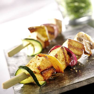 - après brochettes de tofu avec ses légumes grillés barbecue (courgettes, aubergines, poivrons, tomates cerise) |