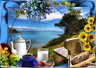 le petit déjeuner est servi sur la terrasse abritée avec vue sur la mer, :P :P c'est bon de partir en voyage par nos pensées!!!, cela fait du bien :) :) |
