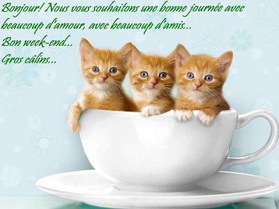 Bonjour les Cop's , toujours le soleil chez nous . Cela me met de bonne humeur Profitons en !!!!!!! Une petite marche , puis je passe aux fourneaux , cet aprem j'ai des amies qui viennent pour un p'tit café + quelques gourmandises, et ce soir nous avons réunion pour le compte rendu de l'omelette , et nous avons décidé de faire un repas ""tiré du sac"", nous serons une vingtaine , donc .......... A plus les belles , plein de pensées pour celles qui ont des soucis de santé pour elles ou leurs conjoints. Gros bisous ....... |
