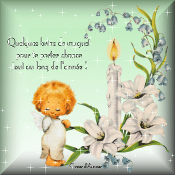 Coucou les amies du coin détente...La journée a failli mal commencer mais heureusement rien de dramatique....mon père est encore tombé ..mais dans son jardin cette fois...il a glissé en cherchant des tuteurs pour ramer ses p'tit pois...résultat une belle bosse !!!! Mais je n'aurai pas laissée cette matinée se terminer sans venir à nouveau vous souhaiter un bon 1er mai...n'est ce pas ma petite LINETTE ? ;) A JEANNE , à ANNIE , à JANINE , à LINOU bien sûr et à vous toutes ...j'envoie plein de clochettes de bonheur...Bisous.. |
