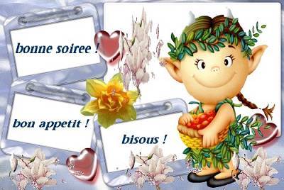 bonsoir, encore une dent de sagesse de partie , je pense que c'étaitla dernière a supprimer , il va falloir penser aux remplacements , donc , je n'ai pas encore fini !!!!! A midi concombre , j'ai refait la quiche poireaux ,saumon frais , c'est un vrai délice. fromage . Ce soir pâtes MM , sauce tomates maison . Quel courage Nickie , je voudrais aussi recommencer ma marche , mais sur la route je n'aime pas , et dans les forets ou les vignes il faudrait les bottes , et pour marcher , c'est pas facile ......... donc on attend !!!!!!!!! A demain , bonne nuit en espérant que le concert du Bon dieu, fera relâche !! Bises à toutes Ce soir pâtes MM, avec sauce tomates maison . |