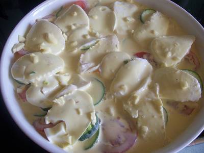 Mettre sur le dessus les oeufs battus(j'en ai mis 3)avec 15cl de crème liquide (j'ai mis de la crème soja).Parsemer d'ail ..Un peu de parmesan ou de gruyère rapé... |