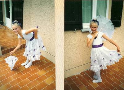 ...COUCOU...SALUT mes GAZELLES!Vous allez bien?Merci de ne pas m'avoir oubliée!...Je me remets peu à peu,mais vraiment peu à peu,avec des tas de rechutes,et les souffrances qui vont avec...La 2è intervention n'a rien fait pour ça!...Bon,passons...La petite fille modèle,que vous voyez a appris à faire le révérence pour vous TOUTES,pour vous remercier de votre gentillesse et de votre fidélité.Elle aurait pu se passer de l'ombrelle,le soleil étant reparti pour de bon vers les heureuses 33...pas juste! |