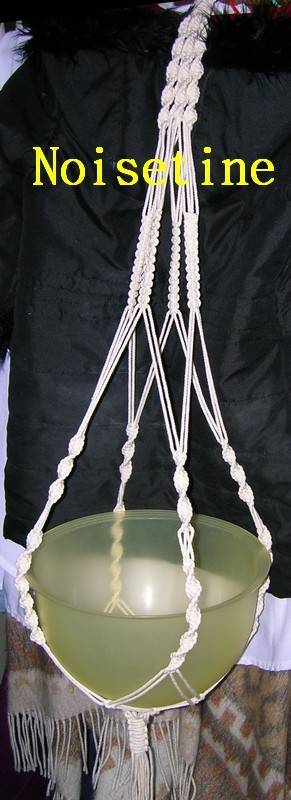 Et ben non , LINOU..je n'ai pas pu participer à ce voyage à NOUMEA...car bien occupée encore aujourd'hui !!!et j'ai aussi été très bavarde...NOUS avons été très bavardes...non non !!! je n'ai,rien dit ;) ...tu avais pourtant trouvé un chauffeur sympa....ce sera pour une autre fois !!! Tu es une véritable artiste JEANNE...très joli sac..trés jolie casquette...et tu peins aussi !!! moi je n'ai plus le temps de rien...j'ai eu ma période macramé....j'ai fait de nombreuses suspensions....comme celle-ci.. |