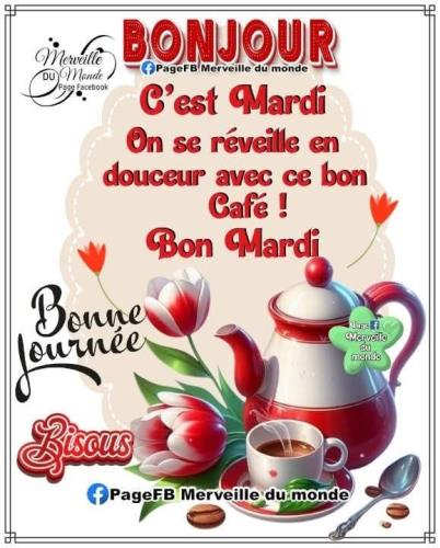 Bonjour Charlotte Je sert le petit café Temps ce matin mitigé nuage un peu de Ciel bleu et gris et un peu de vent Bon mardi |