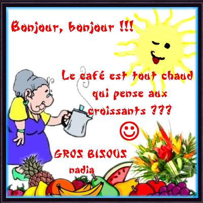 Bonjour tout le monde... Encore pris du poids et là...pas normal....je vais faire un contrôle TSH(hypothyroïdie)... Gribouille j'espère que tu vas en venir à bout de tes bestioles...Nous avons des noisettes à la maison mais pas encore eu ce problème....Le vinaigre blanc(avec produit vaisselle) , c'est une excellente idéee ...c'est bon pour tout... même pour les sols carrelés. NINA , tu ne te trompes pas , je retourne de suite à mes fourneaux.. NADIA , soignes bien ton rhume .... ah ! le linge des enfants , j'ai aussi connu , surtout la période où mes 2 ainés étaient en même temps à l'armée et rentraient tous les WE. Bonne journée MORPHO et attention aus petites bêbêtes même si certaines paraissent plutôt sympas... Un coucou également à ISA et un gros bisou à NYMPHEA :-* qui a j'espère passé une bonne nuit. Excellent week-end à toutes... |